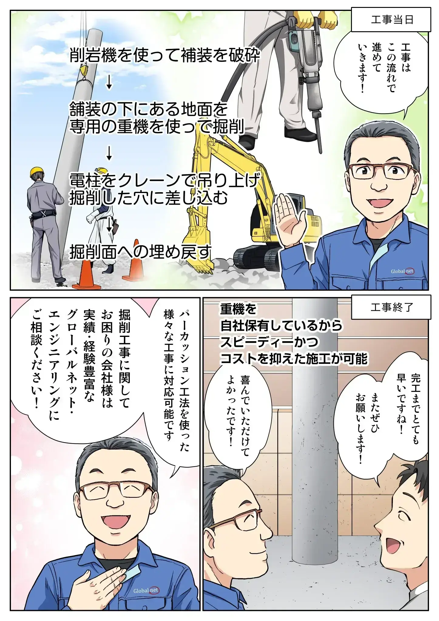 基礎工事の要となる掘削工事はもちろん、電柱を建てる建柱工事から電気通信工事まで幅広い工事に対応していることも、弊社の特長の1つです。